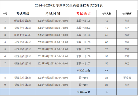 2024-2025(2)学期《研究生英语》课程考试定于2025年6月20日上午8:30-10:00进行,请相关研究生带好考试用品,严格按照《太阳成集团tyc33455cc研究生课程考试考场规则》的要求持有效证件准时到达指定考场参加考试。具体考场安排见附件。