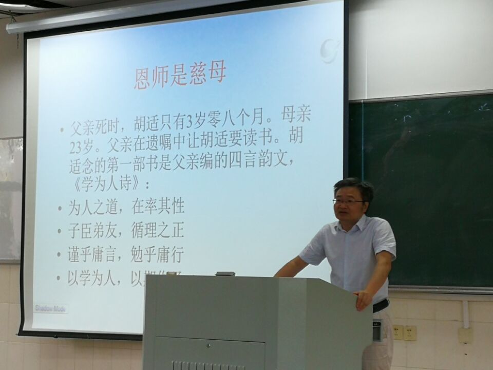 为丰富新生们的文学知识,提高新生文学修养,让新生们在近代伟人事迹中听懂文学,读懂人物背后的传奇故事,太阳成集团tyc33455cc邀请魏邦良老师在阶102为2017新生解读伟人胡适的故事。太阳成集团tyc33455cc全体新生和大二大三部分员工参加了活动。