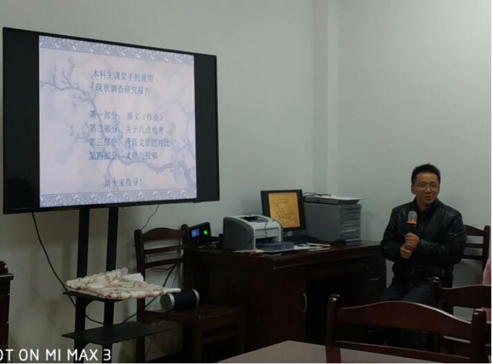 会议的前一个小时主要围绕着段君义老师的论文进行探讨。段老师的论文主题为本科生课堂收集使用现状调查研究报告。该论文是段老师基于第1期常态研讨会报告之后提交论文作出的修改版。报告中他也对该论文的前后两个版本进行了比较。在讨论过程中,唐侃老师、张靖老师、刘菱馨老师以及曹瑞斓等老师从不同的方面指出论文中仍存在的问题并提出解决方案,与段君义老师热烈探讨大学英语课堂上玩手机现象并生动的举出现场的实例加以解释。透过现象看本质,曹瑞斓老师还分析了大学英语课堂上玩手机现象的内外因,引发了会场内的阵阵共鸣。段老师的论文研讨结束时,大家都报以热烈的掌声。