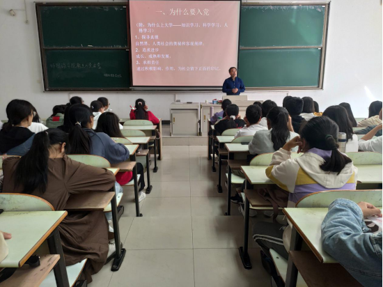 宋洪生老师首先向2020级新生阐述了党的性质、宗旨、基本原则等基本理论知识,并对入党流程进行了详细地介绍。随后宋老师围绕为什么要入党、要入的是什么党、怎样才能入党这三个大问题展开系统地分析和讲解。最后他对2020级新生提出了要求和期望,希望全体新生能够尽快适应大学的学习生活,树立远大的理想和目标,增强责任感和使命感;在日常学习生活中起模范带头作用,关心服务身边的同学,同时要积极进取,追求卓越,不断提升和超越自己。