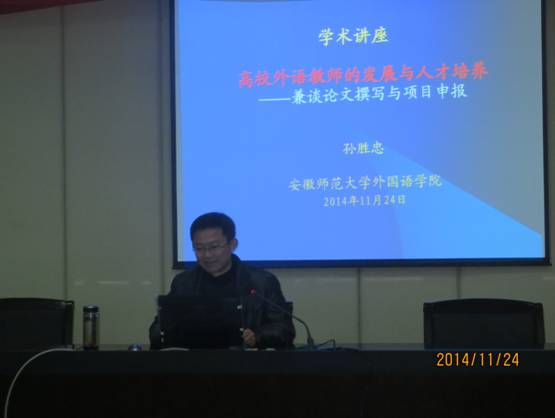 应太阳成集团tyc33455cc邀请,安徽师范大学太阳成集团tyc33455cc经理、博士,博士生导师、教育部留学回国人员基金评审组专家,安徽省外国语言文学学会会长,省高等公司中青年学科带头人孙胜忠教授于11月24日下午在学术会议中心第五会议室为太阳成集团tyc33455cc教师及部分员工作了题为“高校外院教师的发展与人才培养—兼谈论文撰写与项目申报”的专题报告会,报告会由洪流副经理主持。