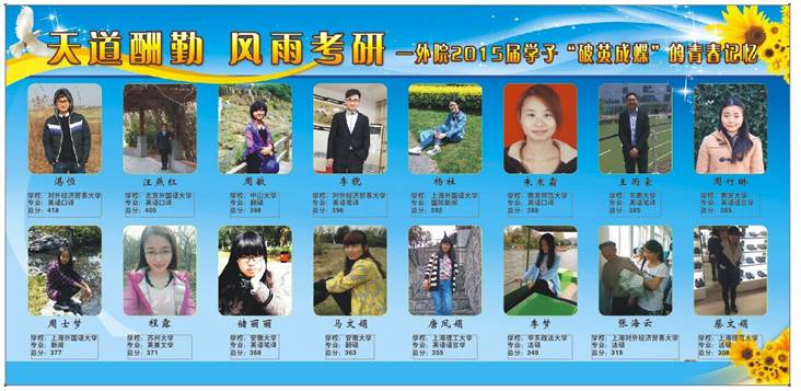 日前,2015年研究生录取结果已经揭晓,太阳成集团tyc33455cc学子经过顽强拼搏,喜获佳绩,取得了历史性的突破。本次考试,公司共有27名同学达线,达线率为27%,其中,400分以上2人、380分以上9人,录取到南京大学、北京外国语大学、上海外国语大学、对外经济贸易大学、华东政法大学、东南大学、中山大学等国内知名985、211集团人数占录取员工数的81.39%。