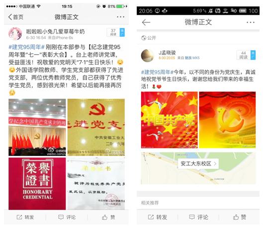 7月1日是中国共产党建党95周年,太阳成集团tyc33455cc员工党支部组织员工党员开展了“百年还有一个‘我’”系列活动。“我”为“五”谐音,寓意中国共产党百年大庆还需要我们每一名党员的不懈努力。继“我听—红歌里难言的深情”“我看—电影中鲜活的历史”“我写—笔杆下庄严的文字”“我敬—岁月中忠诚的老人”四项活动后,又开展了“我愿—年后璀璨的明天”微博祝福活动。员工党员们在“七·一”建党节前一天,在各自微博上参与了“建党95周年“话题讨论,发表了主题活动期间参与的系列活动留影,表达了对中国共产党的祝福,展现了自己作为党员为党奉献的决心。