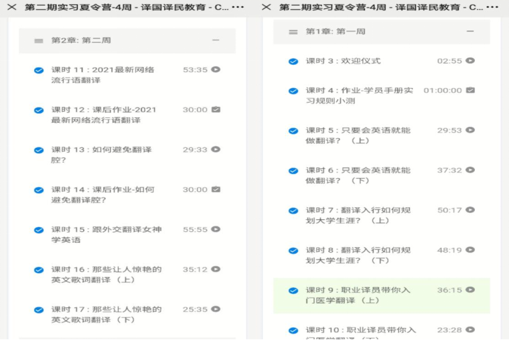 本次实习活动以译国译民的教师定期录播课程为主,同时还邀请很多行业大咖,如北外高翻院李长栓教授,福建师范大学翻译博导岳峰教授,中国翻译协会理事穆雷教授进行直播授课。学员们在课程结束后,完成相应的课后作业和测验,当学习进度达到标准时,可以获得实习证明。实习课程安排松弛有度,所讲授的知识覆盖面广、有深度,既有翻译行业的基本情况和如何进行老员工涯规划,又讲述了趣味热点翻译。这次活动,学员们将自己的专业知识与暑期社会实践相结合,在实习中不断锤炼翻译技能,加强口笔译能力学习,向着高复性翻译人才迈进。