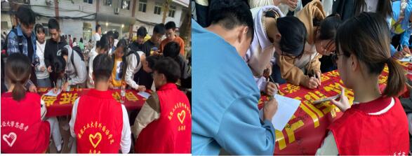 下午四点,志愿者们于在5号宿舍楼下布置好现场,开展宣讲。志愿者们分成两队,一队负责引导同学们按顺序进行签字、签到、扫码加入QQ群;另一队则在路边积极宣传不良网贷,非法传销的危害性,向广大同学讲解传销、诈骗犯罪特点和防范方法,以提高同学们的识别能力,远离传销,谨防上当受骗。活动过程中,同学们积极响应,在横幅上签名之后互相通知好友参加,横幅上布满了同学们的签名。这些签名是同学们对于正确消费意识的确信,是对自己日常消费行为的约束。