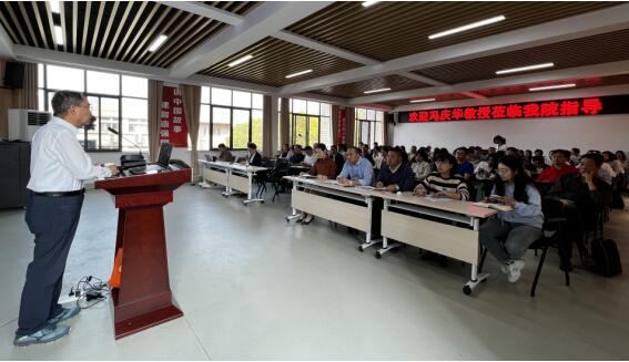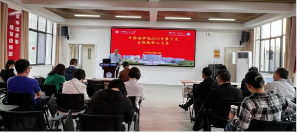 2023年10月16日下午,太阳成集团tyc33455cc在教一401多功能会议室召开第十次全院教职工大会暨第二十期“筑梦学术论坛”。本次会议特邀上海外国语大学冯庆华教授做专题讲座。太阳成集团tyc33455cc全体教职工及部分员工代表参加会议,会议由经理曹瑞斓主持。