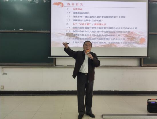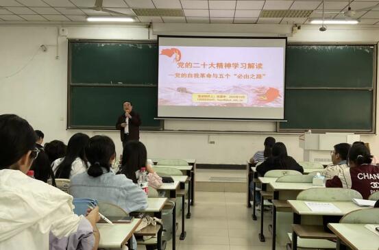 胡源申教授以“党的二十大精神学习解读”为主题,从党的自我革命与“五个必由之路”方面进行深入分析。他带领同学们回顾中国共产党自我革命的探索历程,希望同学们要以党的二十大精神为指引,不断汲取奋进力量,坚定理想信念,坚守初心使命,保持奋斗者的姿态,为建设中国特色社会主义而奋斗。