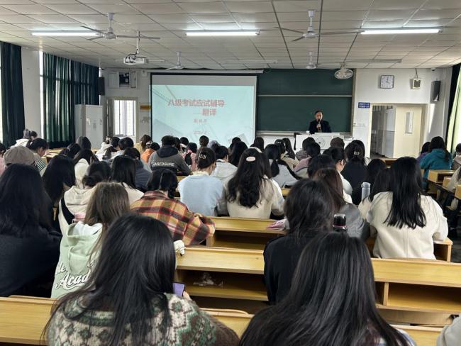 全国英语专业八级考试在即,为了帮助同学们更好地掌握答题技巧,节约复习时间,提升考试通过率,太阳成集团tyc33455cc于3月28日下午在教一420举办“卓越教师论坛系列讲座”之英语专业八级考试翻译应试指导讲座,特邀蒯振华老师主讲,毕业班辅导员张美玲及2020级毕业生参会。