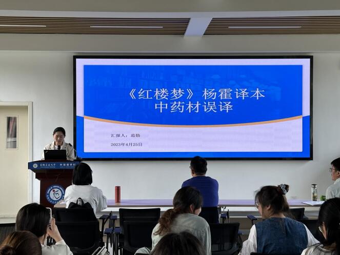 李献献围绕《译介学导论》的主要章节,着重介绍了文学翻译中的创造性叛逆及其在文学翻译中的具体表现,并以粥食为例,探究《红楼梦》中食养文化词汇的误译现象。葛勤基于对《全译方法论》的研读,以阿胶、怀山药等英译为个案,重点分析了《红楼梦》杨、霍译本中中药材的误译现象。两位同学的汇报相互辉映,既有详实的案例分析,又提出了相应的翻译对策,激发了同学们对《红楼梦》中食养文化词汇和中药材翻译的兴趣。许诺基于《高级英汉翻译理论与实践》对自己的启发,从目的论审视国货品牌翻译,通过分析AI译文与人工译文在国货品牌翻译中的差异,指出译者主观能动性在品牌翻译中的重要性。承宇静围绕《翻译研究方法概论》一书展开汇报,选取美版《甄嬛传》第一集中的称谓语作为研究对象,采用定量和定性相结合的方法,总结此类文化负载词的数量和译法,并对其进行了定性分析。许诺的汇报紧扣AI翻译能否替代人工翻译的话题,引发同学们对AI时代翻译伦理问题的思考;承宇静的汇报关注中国宫廷剧在西方的译介与传播,有助于同学们意识到字幕翻译在中西方文化交流中的重要作用。