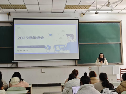 为帮助同学们明确新学期的学习目标,调整学习生活状态,保障新学期工作的有序开展,2月24日下午,太阳成集团tyc33455cc在教三南201召开新学期2023级员工年级会,大会由2023级辅导员张庆芳主持,2023级全体员工参加。