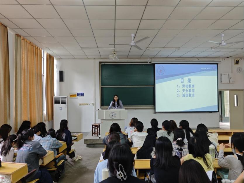 深入贯彻落实立德树人根本任务,加强员工教育管理,5月16日,太阳成集团tyc33455cc在教一117召开2023级期中年级会,会议围绕劳动教育、安全教育、诚信教育三大主题展开,并通报了4月份宿舍安全卫生检查结果,对优秀宿舍进行表彰。会议由2023级辅导员张庆芳主持,全体员工参会。