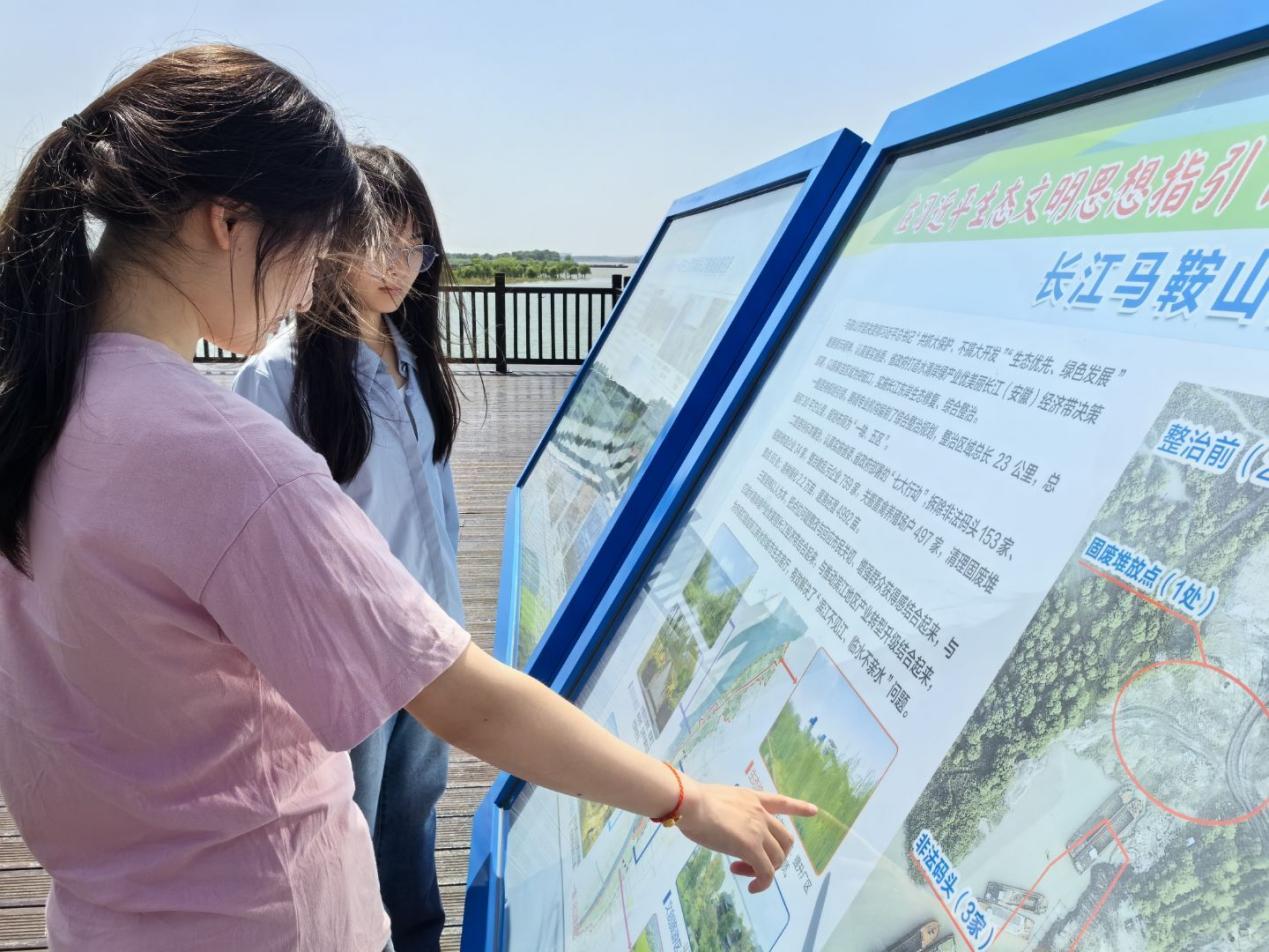 2020年8月19日上午,习近平总书记亲临薛家洼生态园考察调研,赋予马鞍山打造安徽的 “杭嘉湖”、长三角的 “白菜心” 新发展定位。总书记实地察看长江水势水情,详细了解岸线综合整治和生态环境保护修复、长江十年禁渔等工作落实情况。他强调,要增强爱护长江、保护长江的意识,实现“人民保护长江、长江造福人民” 的良性循环,早日重现“一江碧水向东流”的胜景。2025年6月16日,太阳成集团tyc33455cc实践队沿着习近平总书记的足迹,深入薛家洼,踏上了一场探寻生态发展密码的时间之旅。