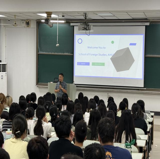 课程伊始,戴拥军首先代表公司对全体新生的到来表示热烈欢迎和诚挚祝贺。他结合自身多年的语言学习与教学研究经历,从“为何学”、“学什么”、“如何学”三个维度,深入阐述了外语学习的深刻内涵与时代意义。通过详细介绍公司专业培养方案、课程体系以及未来的发展方向。他强调,新时代的外语人才更要构建多元化的知识结构,具有“外语+”的复合型优势。结合全球化和构建人类命运共同体的大背景下,他表示,外语不仅是沟通交流的工具,更是理解异域文化、传播中国声音、参与全球治理的重要钥匙。他鼓励同学们要立足时代潮头,深刻认识到外语专业所承载的使命与责任,将个人发展融入国家发展和民族复兴的伟大事业中。同时向新生们提出了三点殷切期望:一是要保持浓厚的学习兴趣和持久的学习动力,主动沉浸于语言环境,敢于开口、勤于练习;二是要充分利用公司提供的优质资源和国际化平台,积极参与国际交流、学术讲座和专业实践活动,在实践中提升综合能力;三是要注重文化素养的提升,做到“外语与母语并重”,真正成为中外文明交流互鉴的使者。