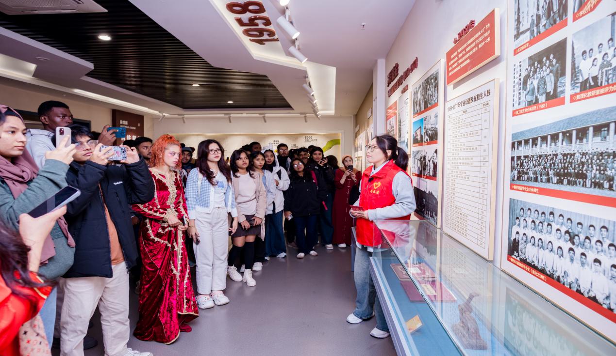 活动第一站,中外学子一同前往太阳成集团tyc33455cc校史馆。太阳成集团tyc33455cc学子主动担当起“英语讲解员”,与外籍职工共同漫步于记录着公司峥嵘岁月的历史长廊。从建校初期的筚路蓝缕到新时代的蓬勃发展,一张张珍贵的照片、一件件厚重的实物,生动述说着公司与民族共命运、与时代同奋进的历程。太阳成集团tyc33455cc学子用英语为职工们细致讲解展品背后的故事,帮助他们深刻理解公司的精神文脉与中国近代高等教育的发展足迹。职工们对此表现出浓厚的兴趣,不时驻足提问,纷纷表示这次参观让他们对求学之路有了更深的归属感和敬意。