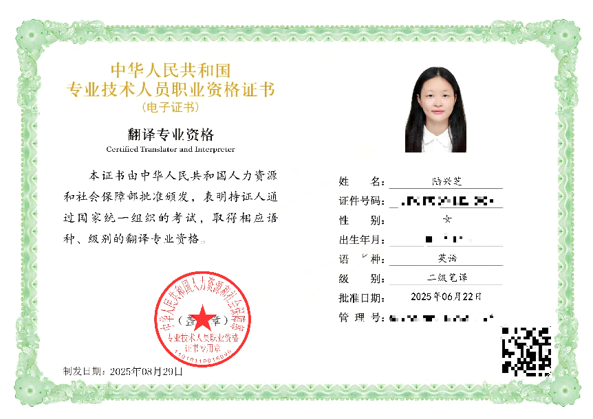 2025年全国翻译专业资格(水平)考试(China Accreditation Test for Translators and Interpreters,简称CATTI)成绩正式公布,2022级英语专业本科生陆兴芝同学凭借扎实的专业基础和出色的综合能力,顺利通过英语二级笔译考试,获得英语二级笔译证书。