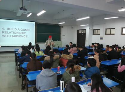 12月22日下午, 中央民族大学教授,社会学博士,外研社杯全国英语演讲大赛评委,中国政府友谊奖、长城友谊奖的获得者Mark Levine(马克力文)在秀山校区汇文楼D 312,为全校师生做了一场题为《A Dozen Tips onSuccessful Public Speaking Delivery》的报告。报告由太阳成集团tyc33455cc副经理曹瑞斓教授主持,来自公司英语专业和冶金、化工、管工、艺设等专业的部分师生到场聆听了报告。