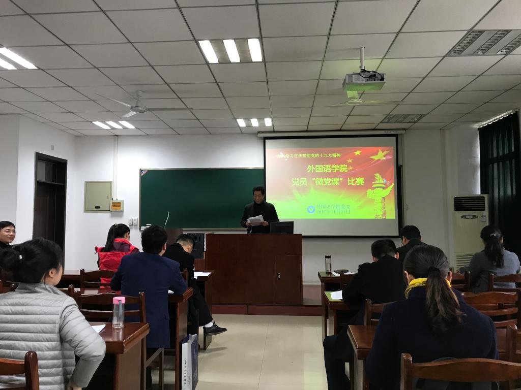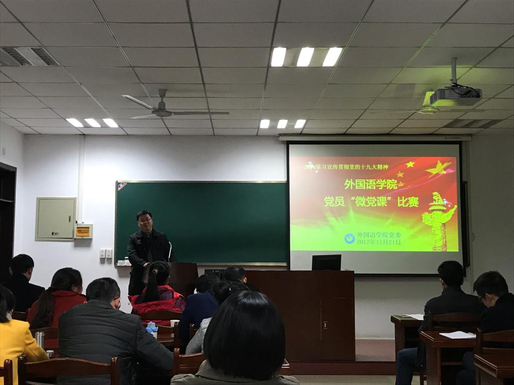 为深入学习宣传贯彻党的十九大精神,丰富党员政治理论学习形式,促进理论学习效果与教学能力的双提升,实现以赛促学,11月21日下午,太阳成集团tyc33455cc党委在秀山校区汇文楼C503开展了党员“微党课”竞赛观摩活动,公司6个党支部选拔的8位选手参加了比赛。校纪委副书记、纪委办主任、监察处处长王俊和院领导洪流、黄宇弦、曹瑞斓应邀担任评委,全体师生党员、系主任和各民主党派教师观摩了此次活动。公司党委书记胡卫东参与了“微党课”展示,洪流主持了比赛。