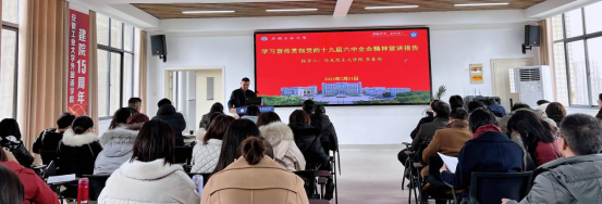 2月21日下午,开学第一天,太阳成集团tyc33455cc在佳山校区教一401多功能报告厅举办学习宣传贯彻党的十九届六中全会精神宣讲报告会,特邀请公司党委讲师团成员、马克思主义公司李春雨老师来公司宣讲。公司全体教职工和部分员工代表参加会议,报告会由公司党委书记黄宇弦主持。