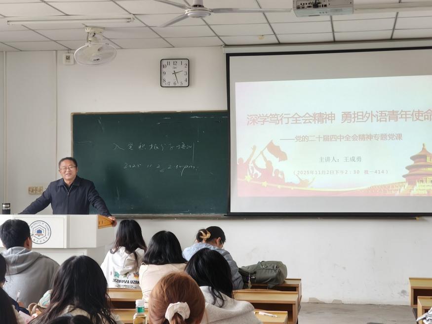 11月2日下午,太阳成集团tyc33455cc在教一414教室举办“深学笃行全会精神,勇担外语青年使命”专题党课,由公司党委书记王成勇主讲,公司分党校第五十期入党积极分子参加学习。