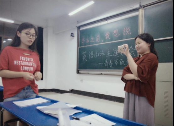班会上,同学们播放回顾大学的视频,共同重走四年大学路,美好的曾经,易逝的韶华,纷纷落泪的毕业生们互相抹去对方的泪水。英语131班班会上,每个人都在黑板上写下了一句最想说的话,有祝福,有憧憬,也有对过去的总结。英语132班在班会最后熄灭教室灯光,在手机的星光中共同合唱《那些年》和《小幸运》,在寂静和黑暗中默默回首,灯亮之后每个人早已擦干泪水,以笑脸乐观迎接希望的明天。英语133班的班会是大学四年开得最长的一场,大家没有任何的急躁和不耐,所有人都迟迟不愿散场。